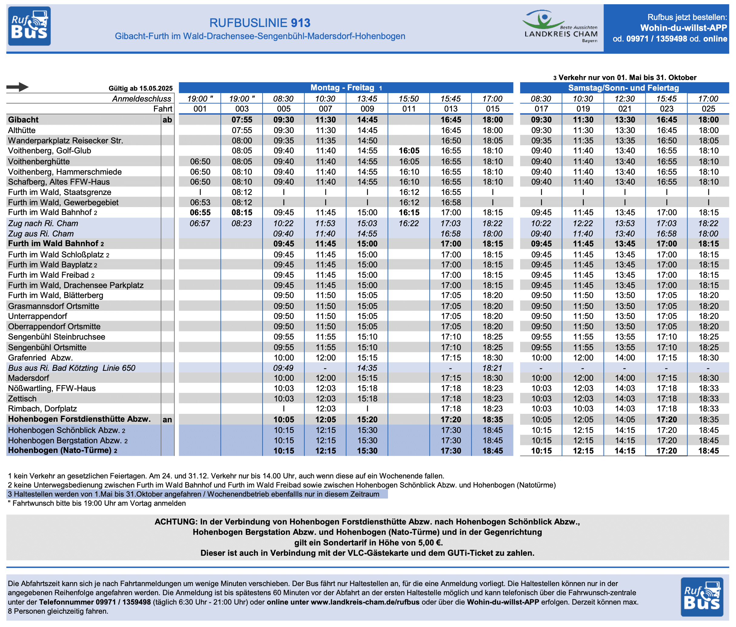 Linie 913 (Rufbus): Verbindung zwischen Furth im Wald – Drachensee – Sengenbühl – Madersdorf – Hohenbogen.