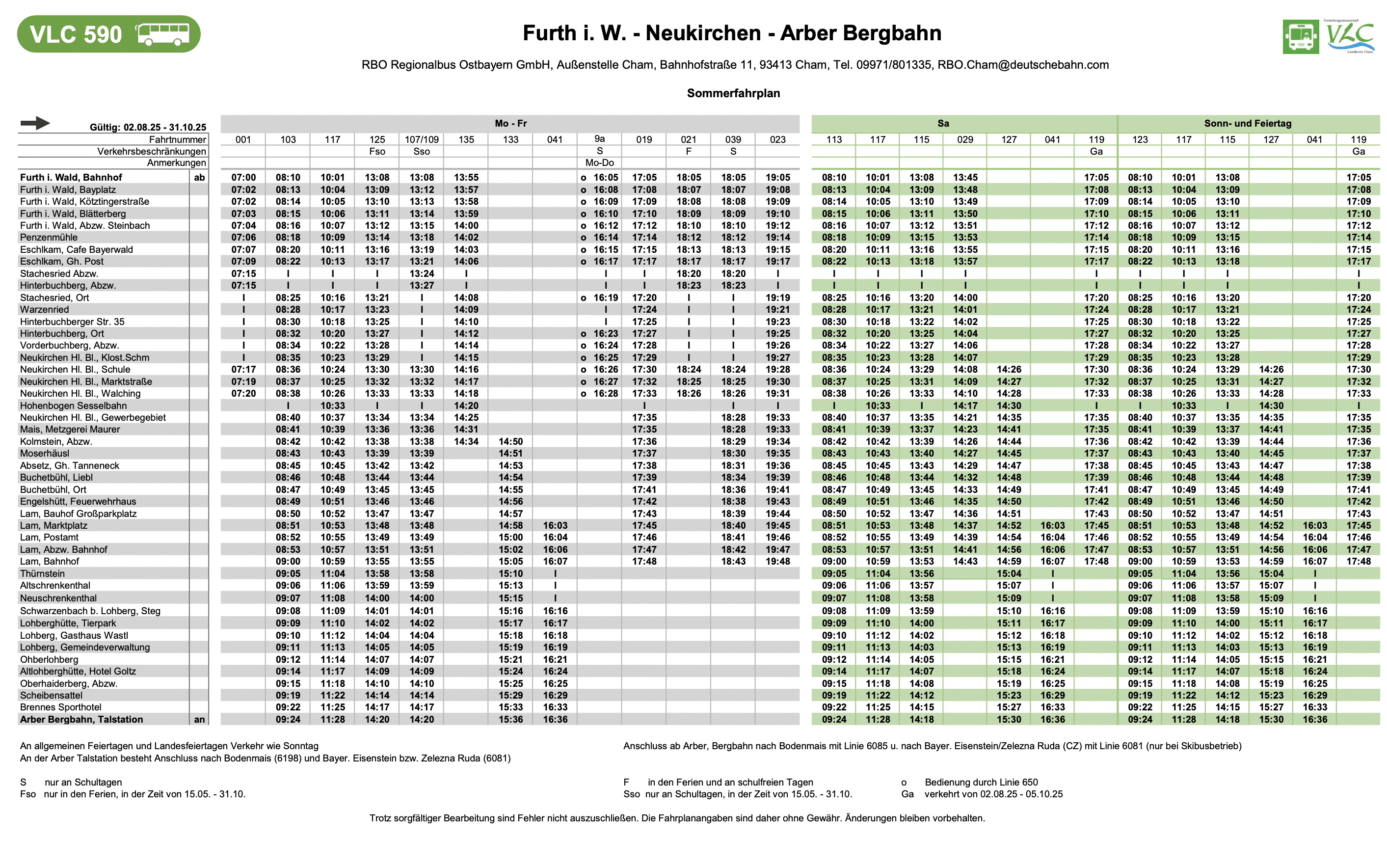 Linie 590 (VLC): Verbindung zwischen Furth im Wald – Neukirchen – Sesselbahn Hohenbogen – Lam – Arber Bergbahn u. umgekehrt